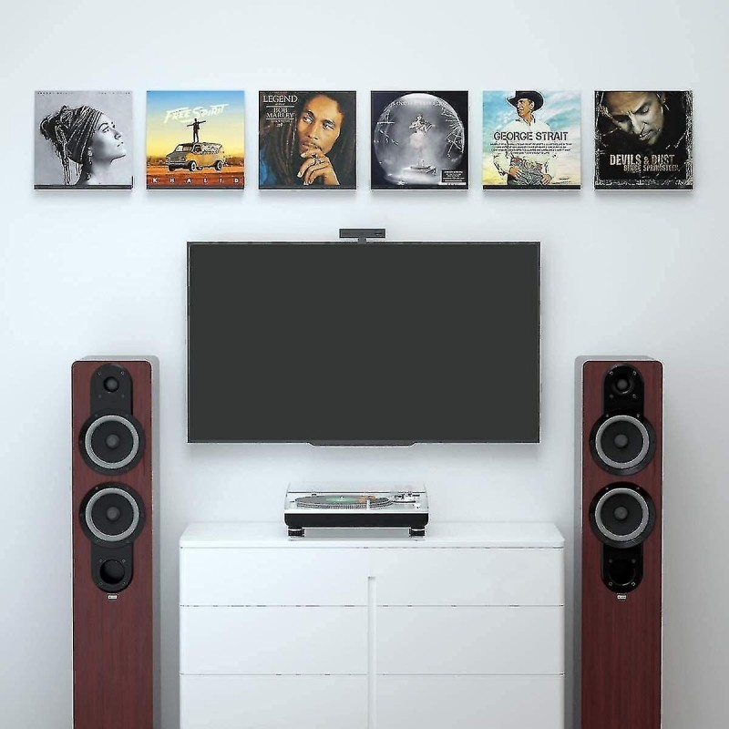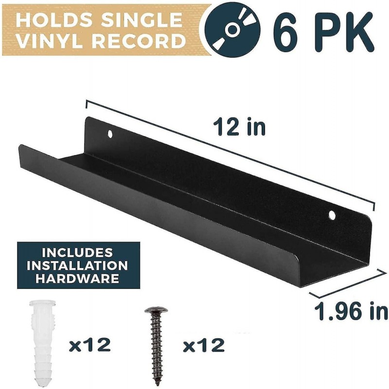 Conjunto de 6 prateleiras transparentes para discos de vinil, 30,5 x 4,3 x 5 cm, com 12 parafusos de fixação. A transparência permite destacar a capa do álbum, facilitando a visualização após a instalação. Um item indispensável para amantes da música que precisam de um sistema de exibição elegante para grandes coleções de vinil.