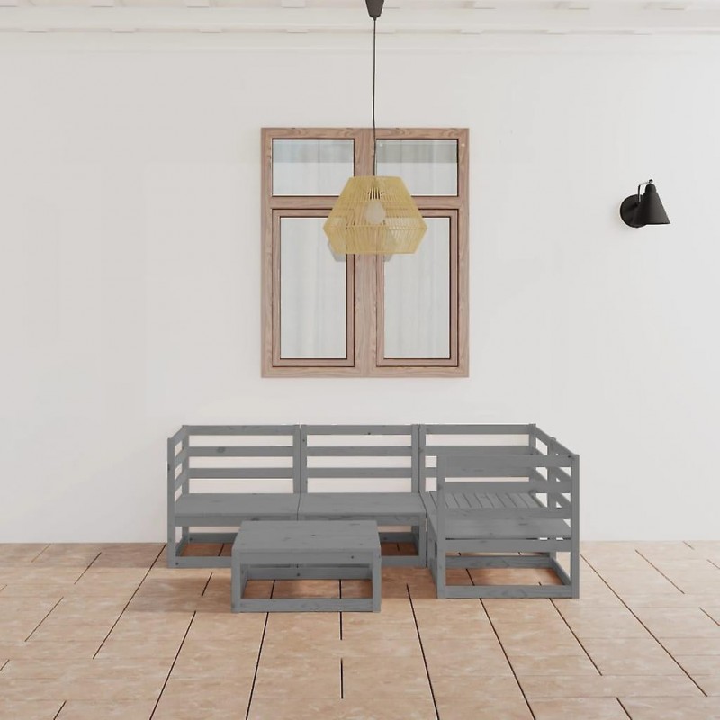 Cor: Cinza Material: Madeira maciça de pinho Dimensões do sofá central/de canto (cada): 70 x 70 x 67 cm (L x P x A) Dimensões da mesa: 70 x 70 x 30 cm (L x P x A) Montagem necessária: Sim Capacidade máxima de carga (por assento): 110 kg Inclui: 3 sofás de canto, 1 sofá central, 1 mesa