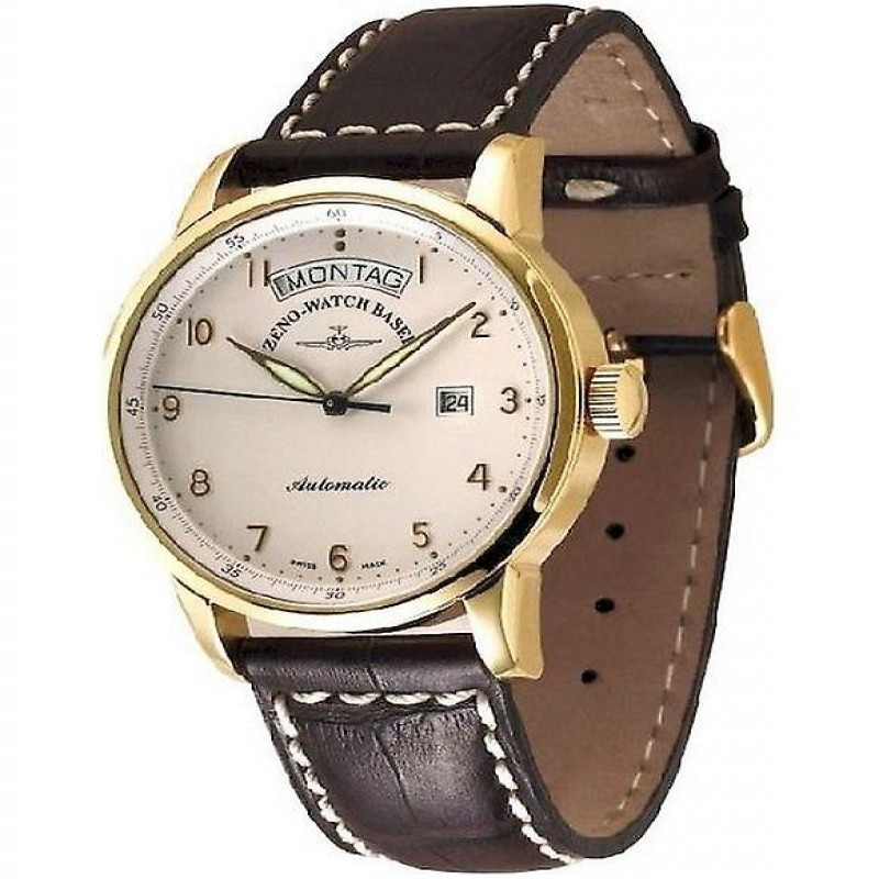 Marca: Zeno Watch Basel Grupo de produtos: Relógios Público-alvo: Masculino Cor da caixa: ouro amarelo Cristal: cristal de safira Material da pulseira: couro; Diâmetro: 42 mm Material da caixa: aço inoxidável Cor do mostrador: branco; Outros: cor preta Outros: fabricado na Suíça Tipo de exibição: analógico Cor da pulseira: marrom Acabamento: polido Formato da caixa: redondo Tipo de relógio: relógios automáticos Tipo de movimento: automático Tipo de fecho: fivela de pino