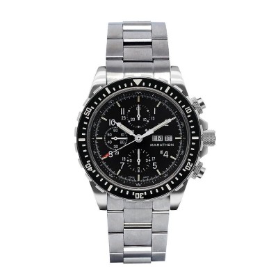 Relógio Marathon Jumbo Pilot/Diver's Automatic Chronograph (CSAR) de 46 mm em aço inoxidável. O relógio Jumbo Pilot/Diver's Automatic Chronograph (CSAR) de 46 mm é comumente conhecido como cronógrafo de Busca e Resgate (CSAR) e é o mais procurado na categoria SAR. Considerado o "Santo Graal" dos nossos relógios, é a escolha ideal para quem exige o melhor em qualidade e desempenho. Com um movimento cronógrafo automático de 25 rubis com precisão de 1/5 de segundo, a função de cronômetro utiliza cronometragem decimal com precisão de 1/100 de minuto para uso em registros de voo e monitoramento de consumo de combustível. O relógio pode rastrear o tempo decorrido por até 12 horas, tornando-o uma escolha ideal para pilotos e mergulhadores. O movimento é alimentado por um ETA Valjoux 7750 com amortecedor Incabloc®, garantindo uma medição do tempo confiável e precisa em todas as situações. O relógio também possui um calendário com dia e data. Para facilitar a leitura em condições de baixa luminosidade, o CSAR possui tubos de trítio e gás MaraGlo®. Funções luminosas. O cristal é feito de safira, o que o torna resistente a riscos e durável, enquanto a coroa rosqueada garante resistência à água até 30 ATM. A caixa e a pulseira são feitas de aço inoxidável 316L com acabamento escovado, oferecendo um visual elegante e moderno. O bisel unidirecional possui escala de 60 minutos e o relógio é resistente à água até 30 ATM, sendo ideal para mergulho e outras atividades aquáticas. O relógio tem um diâmetro de caixa de 46 mm, uma espessura de caixa de 18 mm e uma largura entre as asas de 22 mm. Movimento: ETA Valjoux 7750 com Incabloc; Amortecedor de choqueNúmero de joias: 25Quantidade de escala: 2Faixa de escala: 1-12 (13-24)Tipo de calendário: Dia e dataFunções luminosas: Tubos de gás trítio e MaraGloMaterial do cristal: SafiraTipo de coroa: RosqueadaMaterial da caixa: Aço inoxidável 316LAcabamento da caixa: EscovadoTipo de bisel: UnidirecionalEscala do bisel: 60 minutosResistência à água: 30 ATMDiâmetro da caixa: 46 mmEspessura da caixa: 18 mmLargura da protuberância: 22 mmMarathon WatchesCategorias - Feminino / RelógiosMaterial - Aço inoxidável