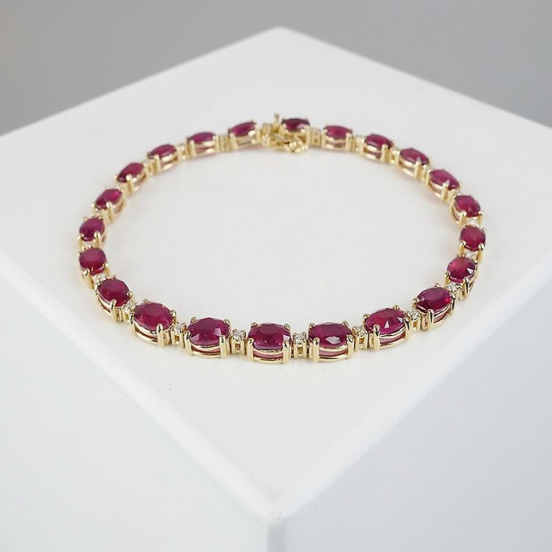 Marca: Christian ? Material: Ouro amarelo 14 quilates (585) ? Série: Coleção de pulseiras Christian ? Tipo de joia: Pulseira ? Pedras preciosas: Rubi e diamante ? Rubi: 14,42 ct (natural) ? Cor: Cor intensa ? Dimensões: 6 x 4 mm ? Diamante: Lapidação brilhante 0,27 ct. Cor: G ? Pureza: VSI ? Comprimento: 18 cm ? Largura: 4 mm ? Fecho: Fecho de caixa (com 2 fechos) ? Densidade: Formato em U simples ? Garantia: 2 anos ? Para: Mulheres ? EAN: 8719878015345 Esta joia não está disponível em loja física. Disponível apenas online. Expansível e retrátil. Para mais informações, ligue ou envie um e-mail.